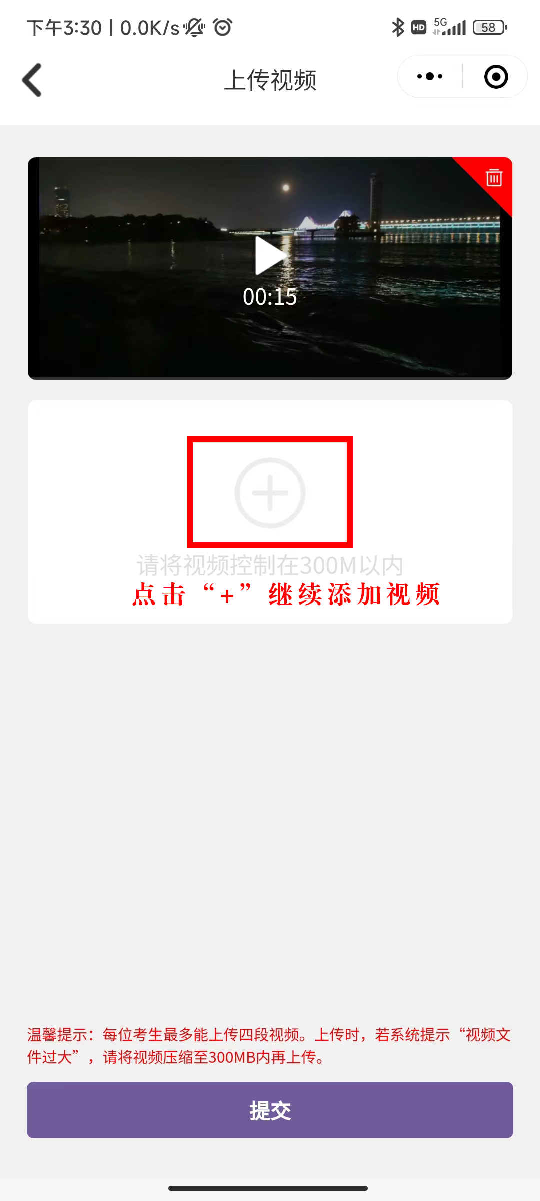 点击“+”(如下图),选择手机上已经录制好的视频文件(文件大小需限制在300MB以内)进行上传。