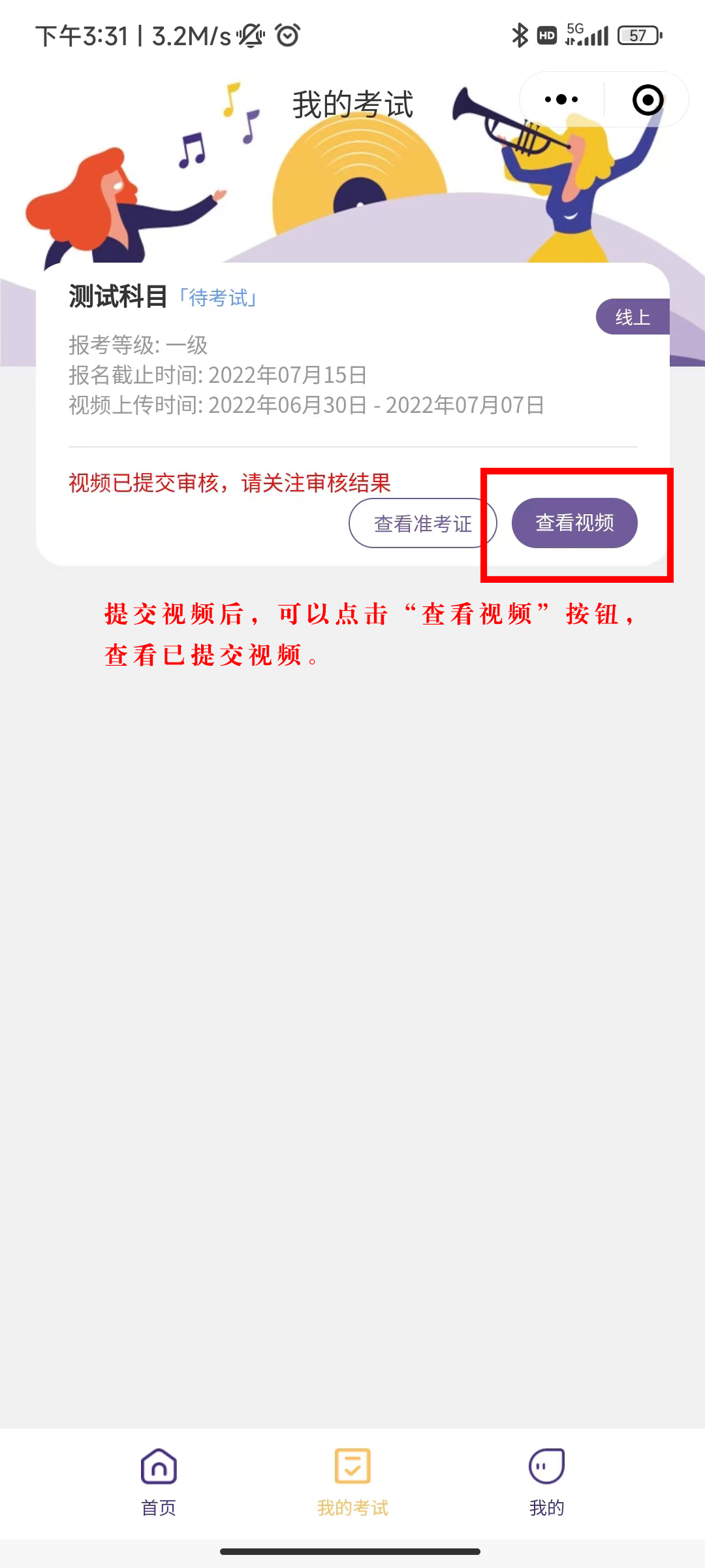 登录浙音考级系统平台,到“我的考试”界面。